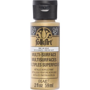 With FolkArt Multi-Surface Acrylic paint, you can paint wood, glass, ceramic, metal, terra cotta, rigid plastic, canvas, styrofoam, slate, paper mache and fabric—all with the same bottle! The patented, self-sealing formula offers superior coverage for fewer coats and quicker drying times. With a dishwasher-safe metallic finish, this water-based non-toxic formula resists moisture as well as rust and comes in a wide color palette including basics and trend-right shades.