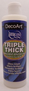 DecoArt Triple Thick Brush Gloss: Triple Thick Gloss Glaze is ideal for adding a glazed ceramic look to a variety of hard craft surfaces. Because it is extra-thick, only one coat is needed for most surfaces. Can be applied on Wood, Wicker, Plaster, Papier Mache, Resins, Painted china, Pre-primed metal, Pinecones, Jewellery, Bisque, Artificial Flowers and more. Goes on smoothly with no stroke marks. Finish results provide the illusion of depth and creates a glazed ceramic look. Resists cracking